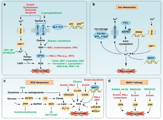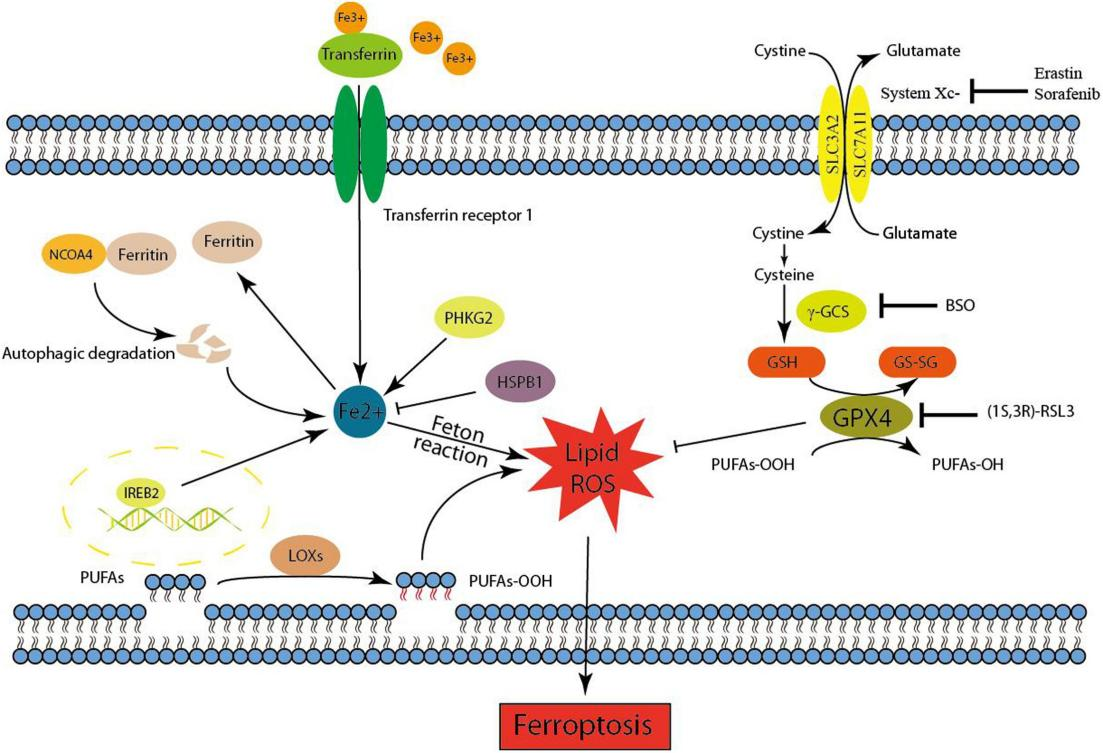 ?System Xc-胱氨酸/谷氨酸转运体的抑制:System Xc-是一个位于细胞膜上的异二聚体转运蛋白(由SLC7A11和SLC3A2组成),负责将细胞外的胱氨酸(Cystine)转运入胞,同时将胞内的谷氨酸(Glutamate)交换出去。胞内的胱氨酸会被还原为半胱氨酸(Cysteine),这是合成GSH的关键原料。因此,抑制System Xc-(如使用Erastin、索拉非尼等药物),会切断胱氨酸供应,导致GSH合成受阻,继而间接抑制GPX4功能。SLC7A11的表达调控,尤其是其转录因子(如NRF2、p53、ATF4等)的作用,是连接上游信号与铁死亡的关键桥梁。