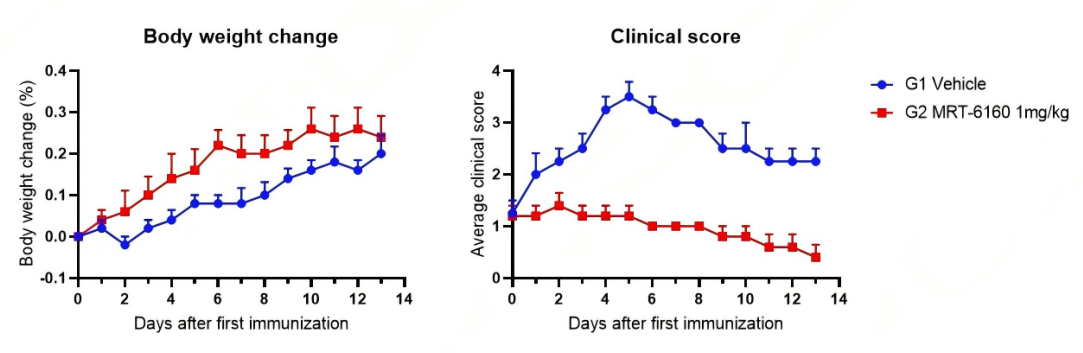 1、PTX成功构建C57BL/6小鼠EAE模型,使用MRT-6160治疗后症状减轻。
