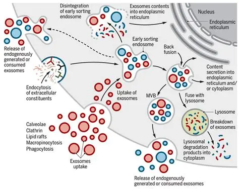 外泌体通过多种机制参与细胞间通讯:它们可以直接与靶细胞膜融合释放内容物,也可以通过表面配体与受体结合激活信号通路,甚至可以通过内吞作用进入细胞。这些通讯方式在生理和病理过程中都发挥着关键作用。