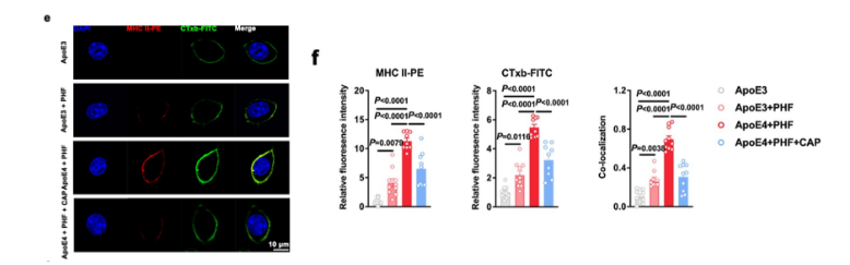共定位分析:与MHC II分子(PE标记)的共定位实验,验证APOE4如何通过胆固醇积累促进MHC II在脂筏中的聚集,从而增强抗原呈递功能。