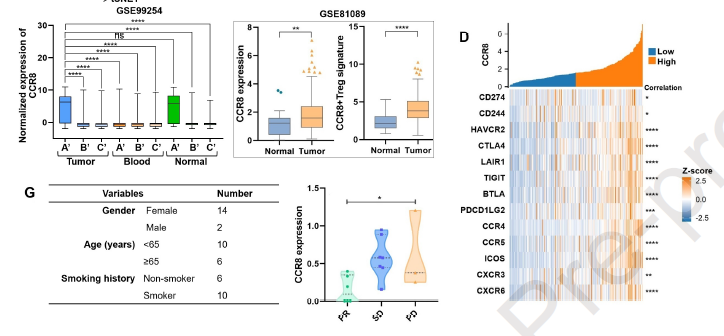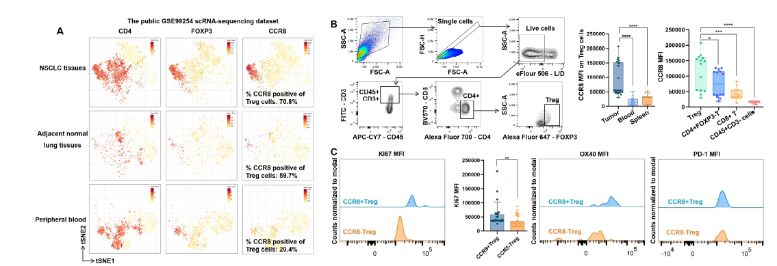 公共数据集(GSE99254、GSE81089)及临床样本,发现 NSCLC 肿瘤中 CCR8?Treg 比例显著高于正常组织,且其丰度与 PD1 抑制剂耐药正相关。