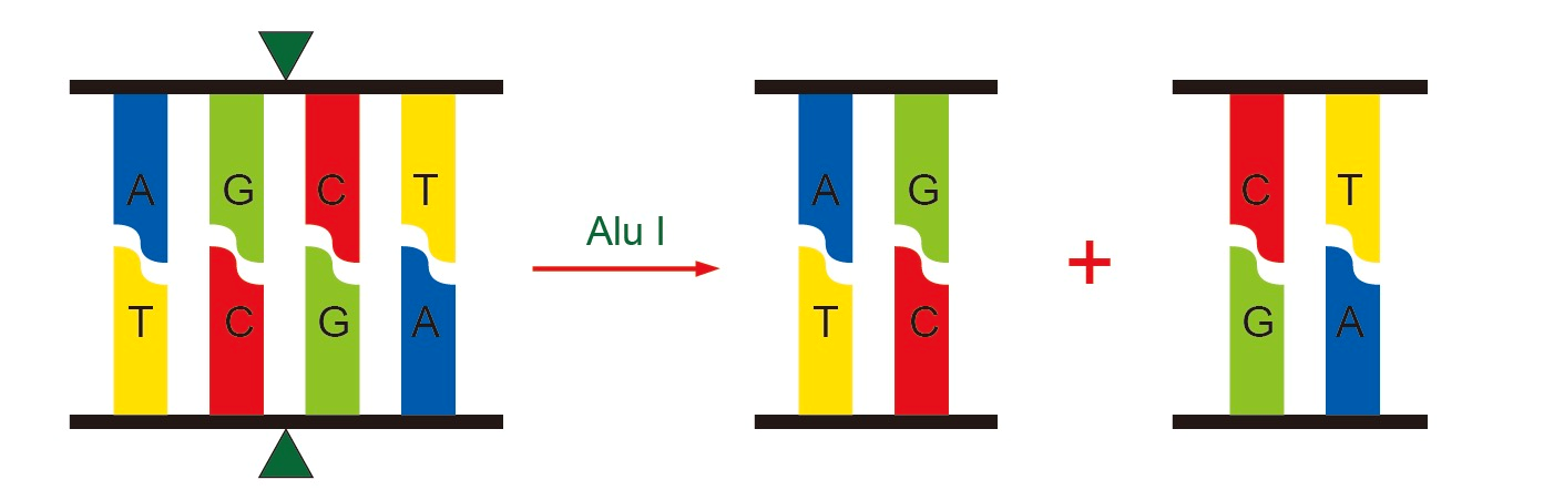 成功的酶切和有效的连接是分子克隆实验圆满完成的必要条件。分子克隆技术中最常用的是Ⅱ型酶,切割后得到的是带粘性末端或平末端的线性DNA。粘性末端,即限制性内切酶在DNA双链上交错切割,形成的核苷酸顺序互补的,可形成氢键的末端(见图2);平末端,限制性内切酶在DNA双链的相同位置切割DNA分子,这样形式的断裂是形成具有平末端的DNA片段(见图3)。