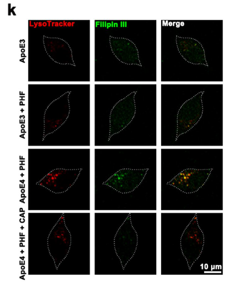 Filipin III 与 LysoTracker Red 联合染色,观察溶酶体中胆固醇聚集情况