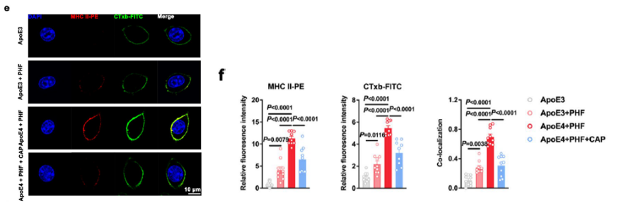共定位分析,揭示机制:在文献研究中,科研团队将 8μg/mL CTxb-FITC 与 MHC II-PE 抗体联合染色(4℃孵育 30 分钟),通过共聚焦显微镜观察到 “APOE4+PHF 组 MHC II 在脂质筏上的聚集显著增加,辣椒素可减少这一聚集”,直接证实 “APOE4 通过脂质筏调控 MHC II 抗原呈递” 的核心机制。