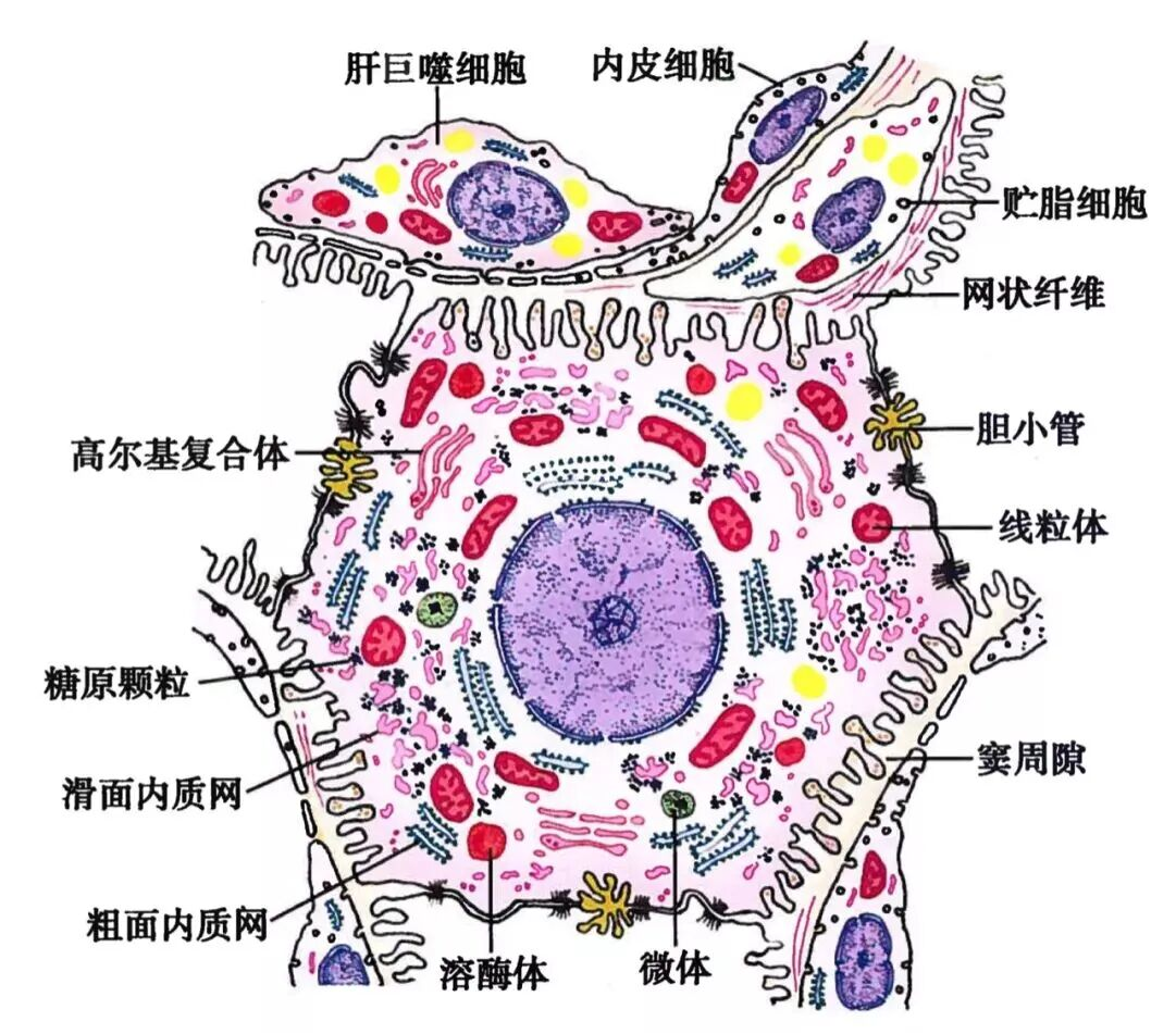4)胆小管:位于肝细胞相邻面,由细胞膜凹陷形成,收集肝细胞分泌的胆汁,最终汇入胆管系统。