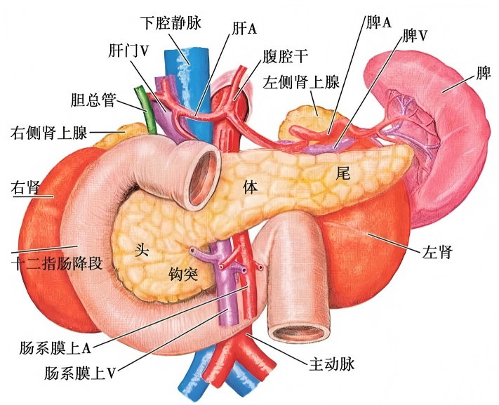 胰腺位于胃后方,分为头、颈、体、尾四部分,兼具外分泌功能(分泌胰液,消化食物)与内分泌功能(分泌胰岛素、胰高血糖素,调节血糖)。