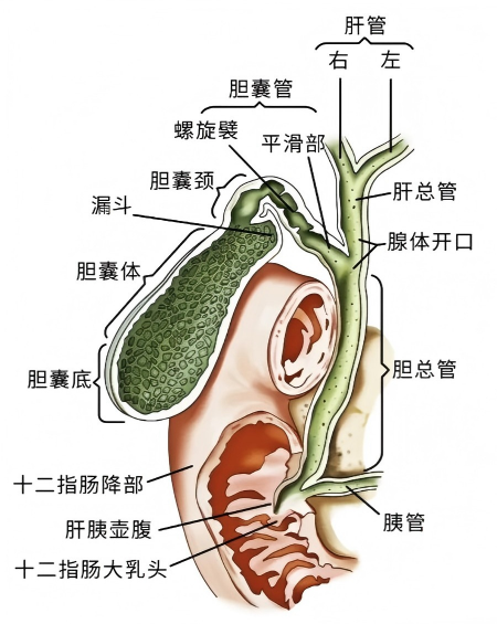 胆由胆囊、胆管系统(肝内胆管、肝外胆管)组成,主要功能为储存、浓缩胆汁,并将胆汁输送至小肠,辅助脂肪消化。
