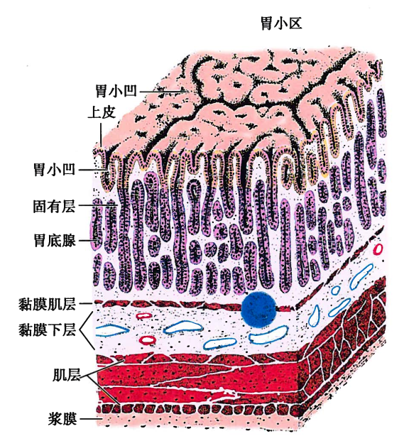 胃壁由内向外同样分为 4 层,核心结构集中于黏膜层: