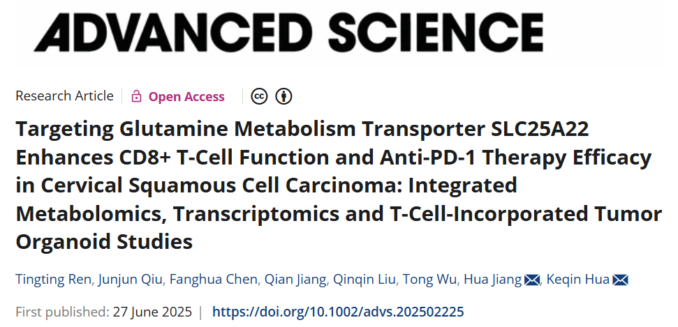 文献标题:Targeting Glutamine Metabolism Transporter SLC25A22 Enhances CD8+ T-Cell Function and Anti-PD-1 Therapy Efficacy in Cervical Squamous Cell Carcinoma: Integrated Metabolomics, Transcriptomics and T-Cell-Incorporated Tumor Organoid Studies