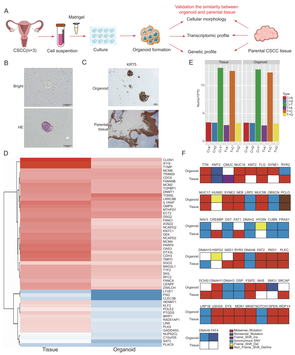 成功建立保留亲代肿瘤组织学和基因组特征的CSCC类器官,为体外研究提供理想平台。