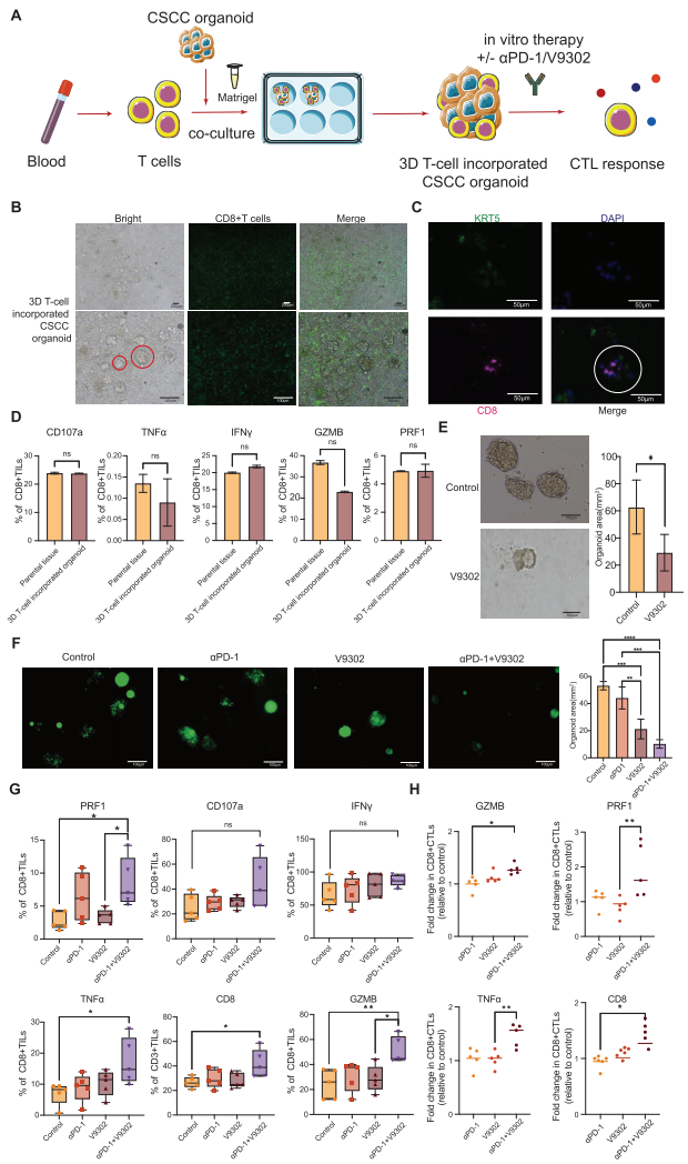 使用谷氨酰胺转运体抑制剂V-9302靶向SLC25A22,在3D类器官模型中显著增强CD8+T细胞毒性分子(如PRF1、GZMB)表达。