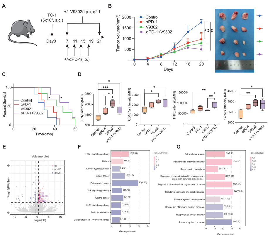 V-9302与抗PD-1抗体联合使用表现出显著的协同效应,显著提高治疗效果。