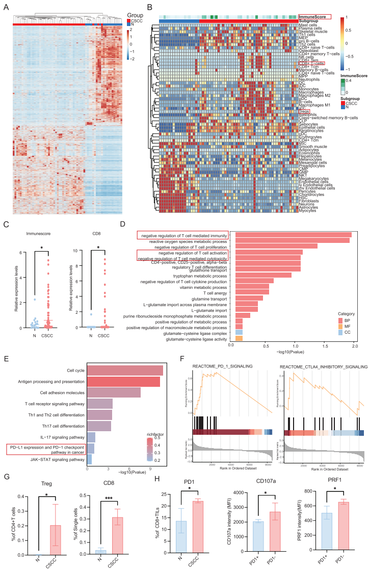 转录组分析显示CSCC存在明显的免疫抑制特征,包括T细胞功能负调控通路的激活和PD-1/PD-L1信号通路的显著富集。