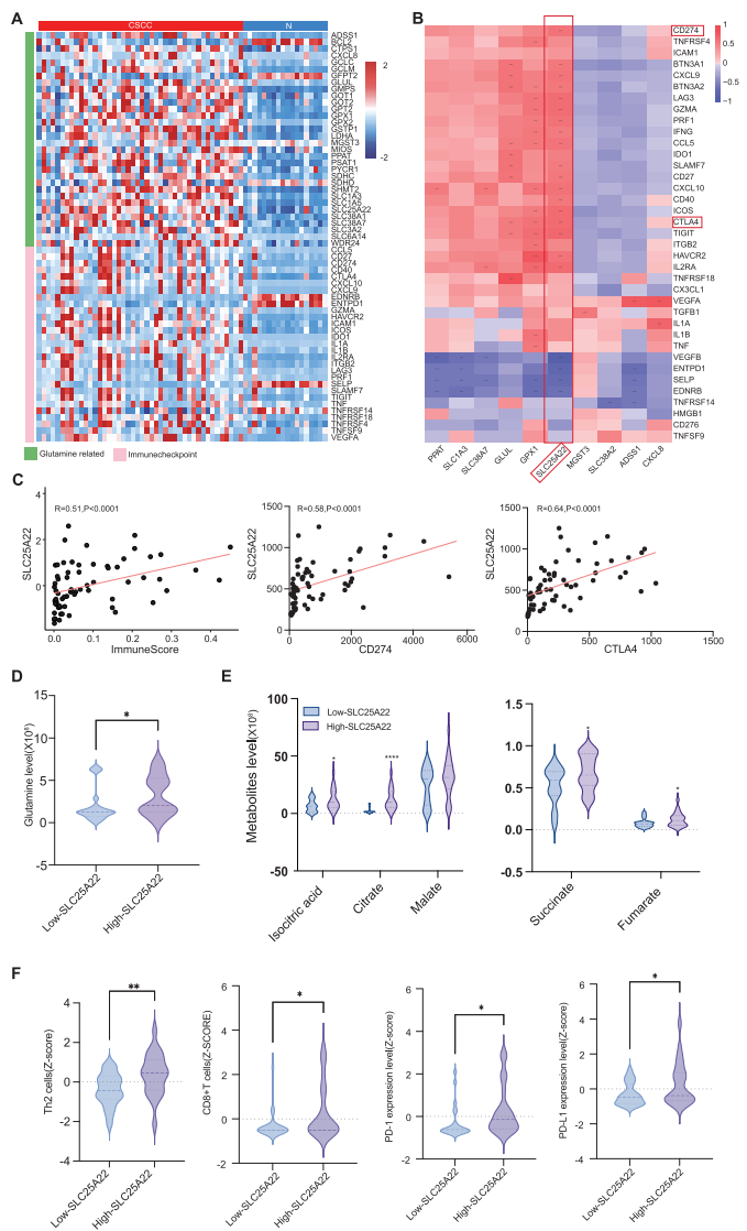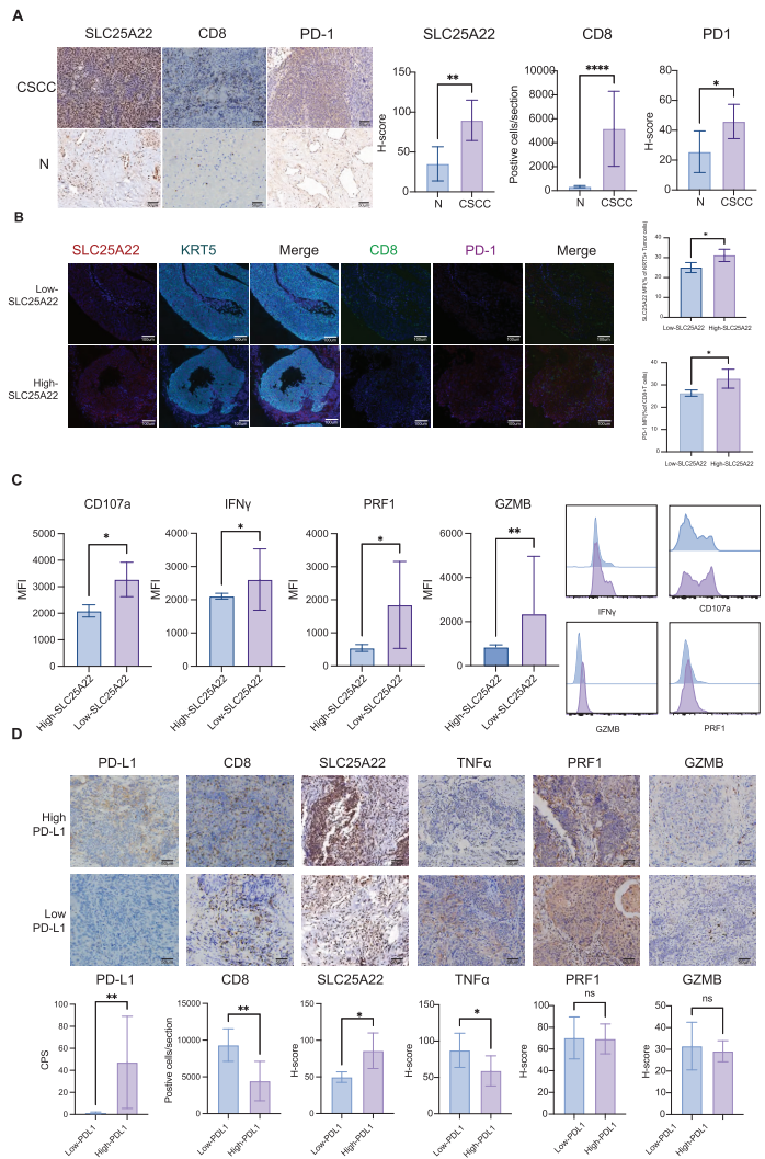 在20例CSCC临床样本中验证发现,SLC25A22高表达与PD-1表达升高、CD8+T细胞毒性降低显著相关,尤其在PD-L1高表达患者中更为明显。