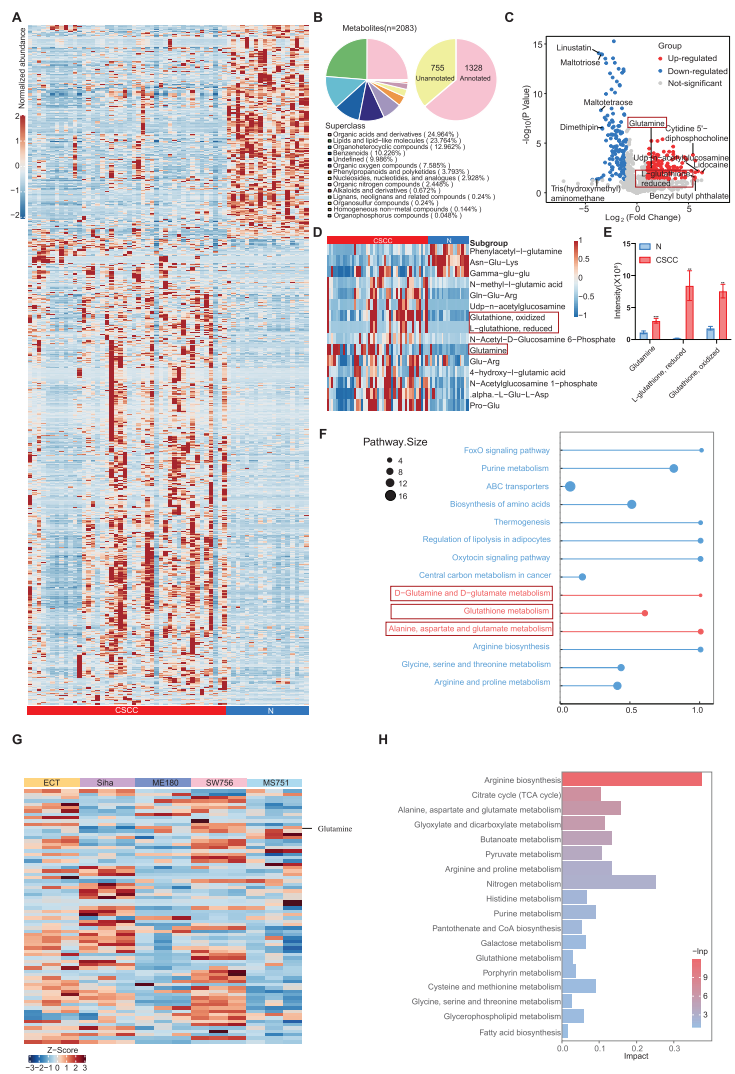 研究团队对44例CSCC和18例正常组织进行代谢组学分析,发现2083种代谢物中,谷氨酰胺及相关代谢物在CSCC组织中显著富集。