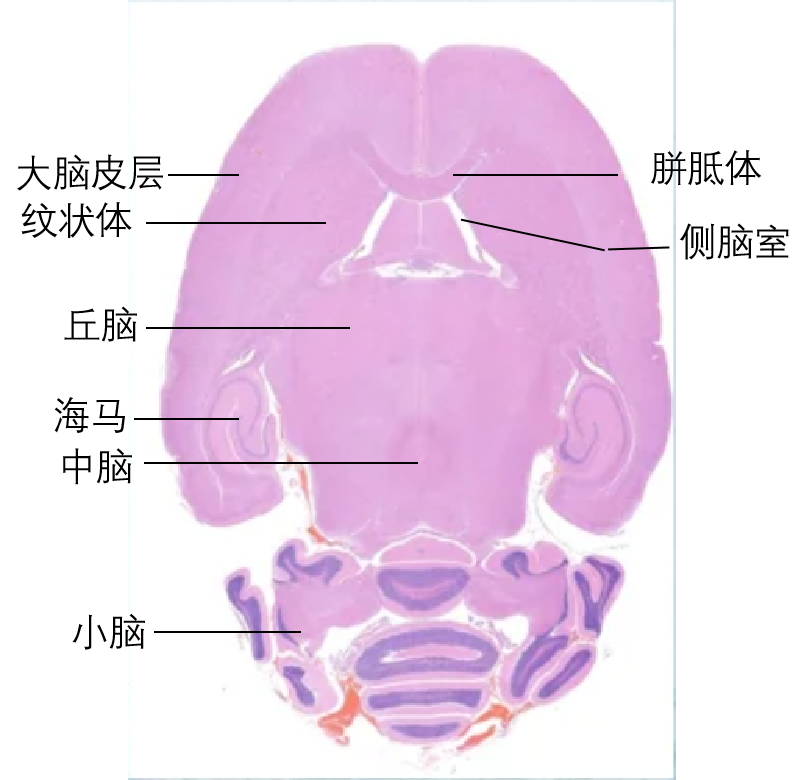 水平切面(将脑分为上下两半):可同时观察皮质、纹状体、海马、中脑、小脑等;看病理分布推荐水平切面 |
