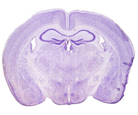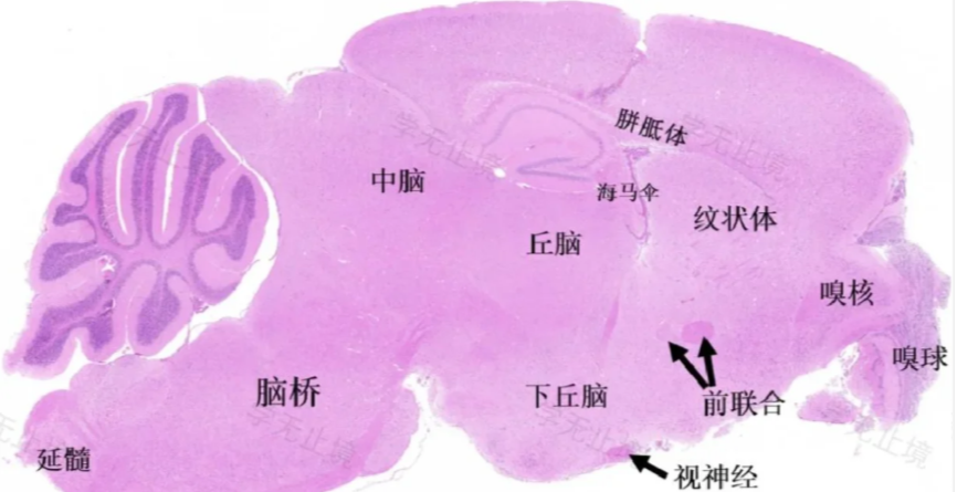 | 冠状切面(将脑分为前后两半):常见切面:前额叶皮层、纹状体 、小海马(经典海马)、大海马(黑质) | 矢状切面(将脑分为左右两半):可同时观察嗅球,皮层,纹状体,海马,小脑等;适合同一标本做不同实验左右对照 |