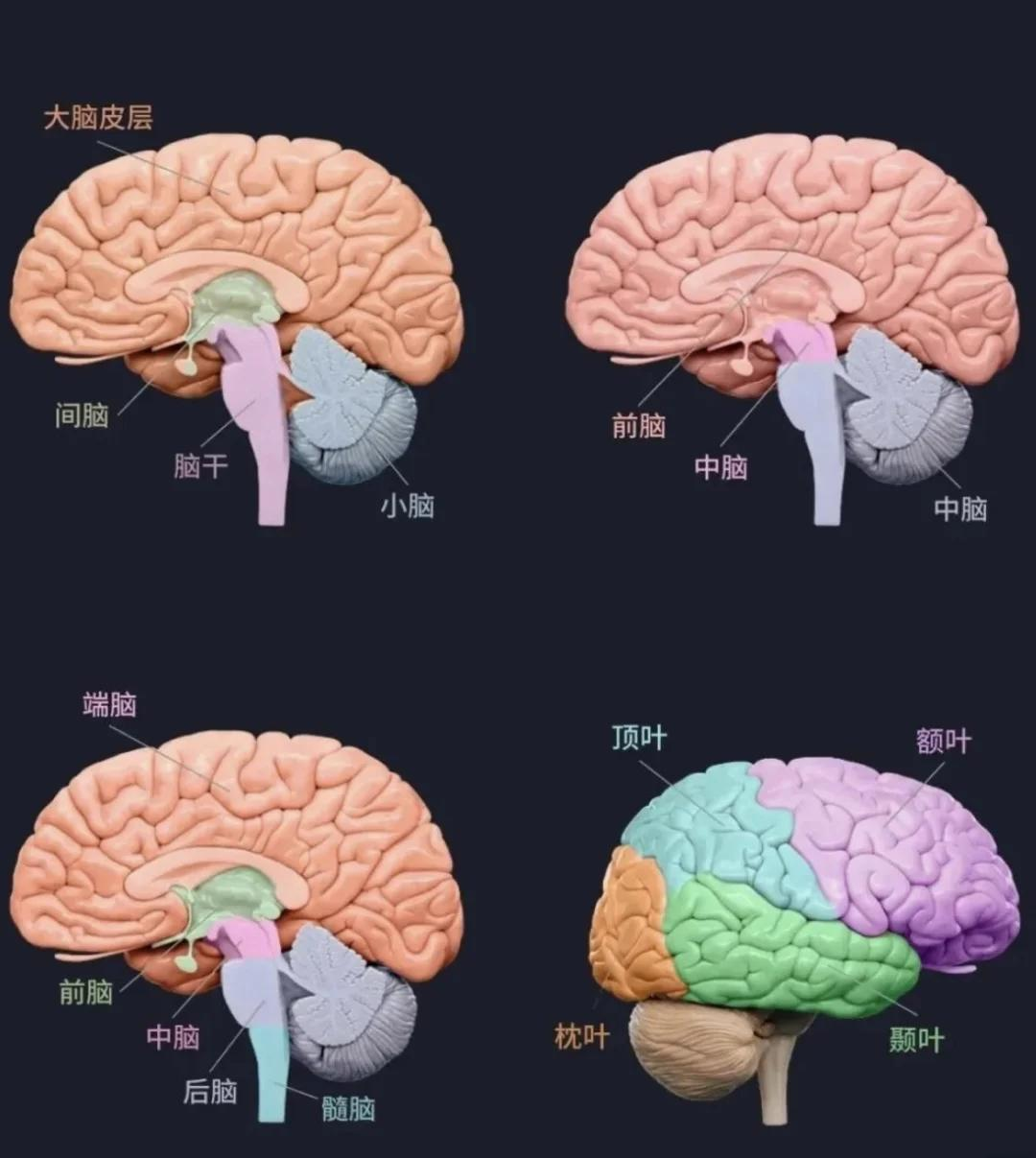 脑组织位于颅腔内,由端脑、间脑、脑干和小脑四部分构成,各部分既相互独立又协同配合,形成完整的神经调控网络。