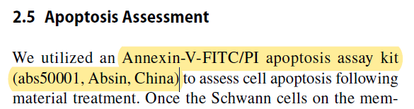 本研究中,团队选用了Absin 的Annexin-V-FITC/PI 凋亡检测试剂盒(货号 abs50001),用于评估压电材料处理后雪旺细胞的凋亡水平。