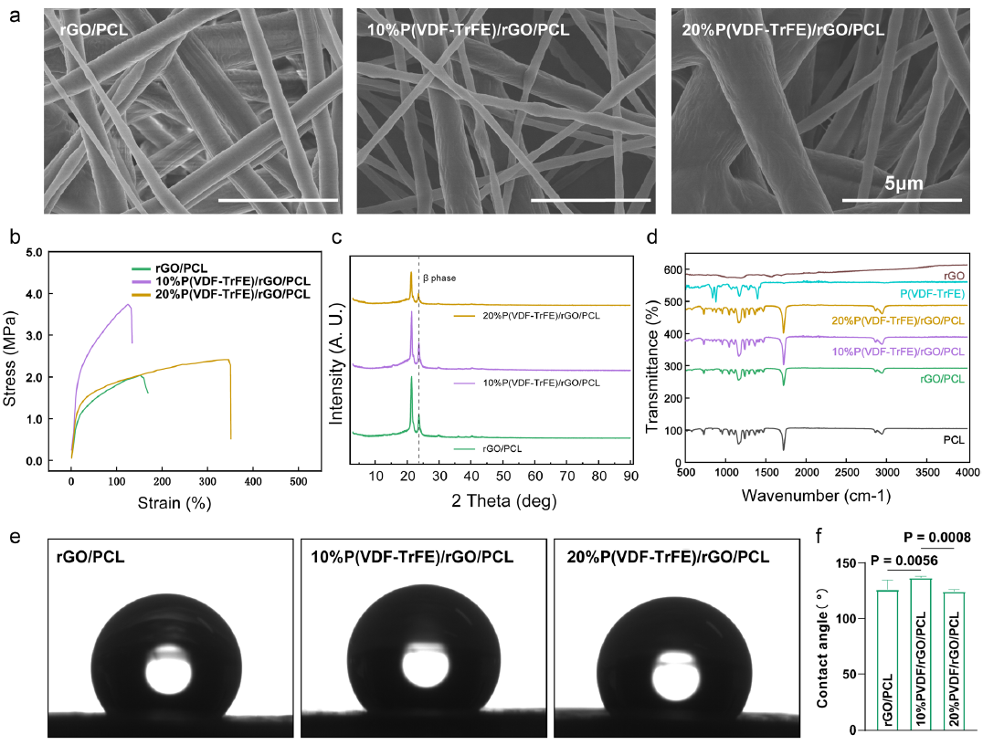 研究团队制备了 rGO/PCL(rP)、10% P (VDF-TrFE)/rGO/PCL(10% PrP)、20% P (VDF-TrFE)/rGO/PCL(20% PrP)三种纤维膜(对应原文图 2a)。