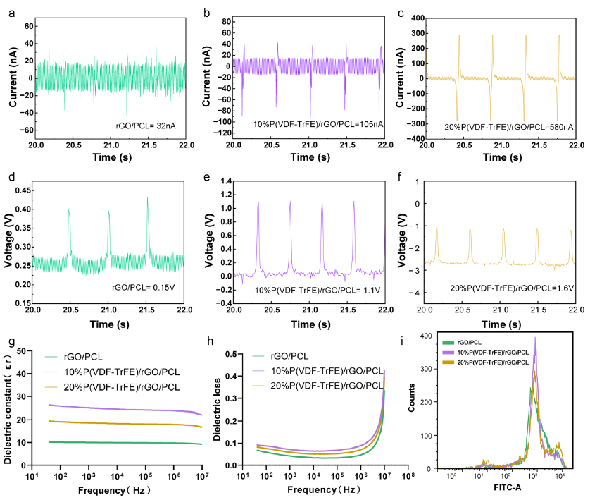 电学测试表明,10% PrP 在微小载荷下可产生稳定电信号,介电常数高且能量损耗低,能有效转化机械形变为细胞可响应的电刺激(原文图 3a-h)。
