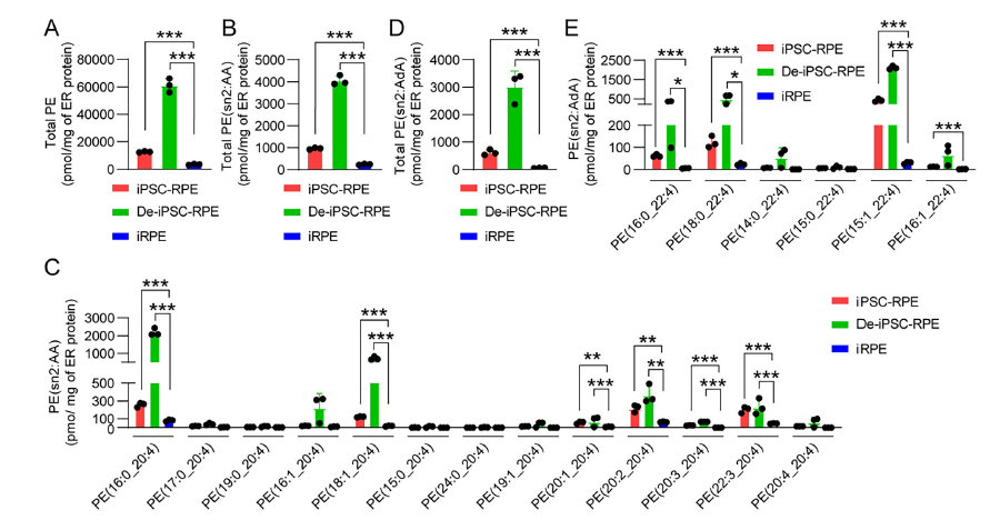 脂质组学分析显示,iRPE 细胞 ER 中总 PE 水平及关键脂质过氧化底物 PE-AA、PE-AdA 水平显著降低(图 2A-E)。通过 meclizine 抑制 PE 合成或乙醇胺升高 PE 水平的干预实验,直接证实:适度降低 PE 可增强 RPE 细胞抗铁死亡能力,而 PE 过度减少会导致细胞死亡。