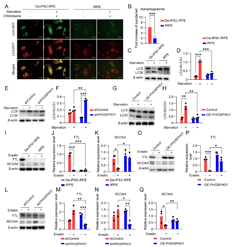 铁蛋白自噬通路验证:通过 Western blot 检测发现,敲低 PHOSPHO1 后,iRPE 细胞中 NCOA4 表达升高,FTL(铁蛋白轻链)表达降低,证实铁蛋白自噬激活(图 6L-N);过表达 PHOSPHO1 则显著抑制 NCOA4 表达,阻断铁蛋白自噬(图 6O-Q)。